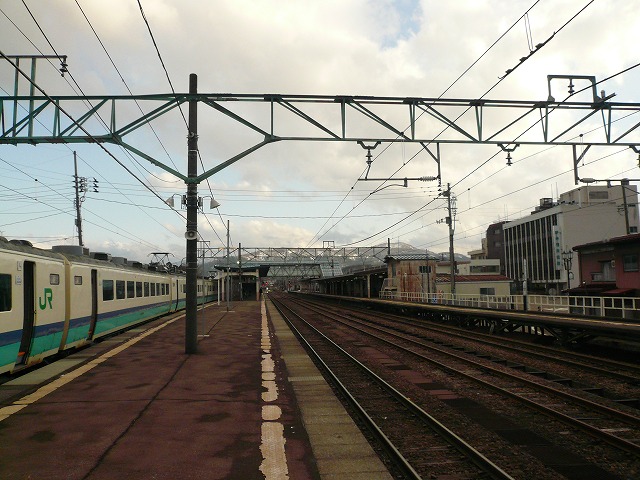 で、この後長岡までの「快速くびきの」に乗るべくここで下車。晴れ間も見えますが、小雨が降ってます。