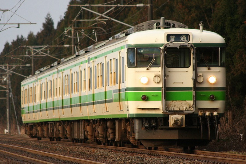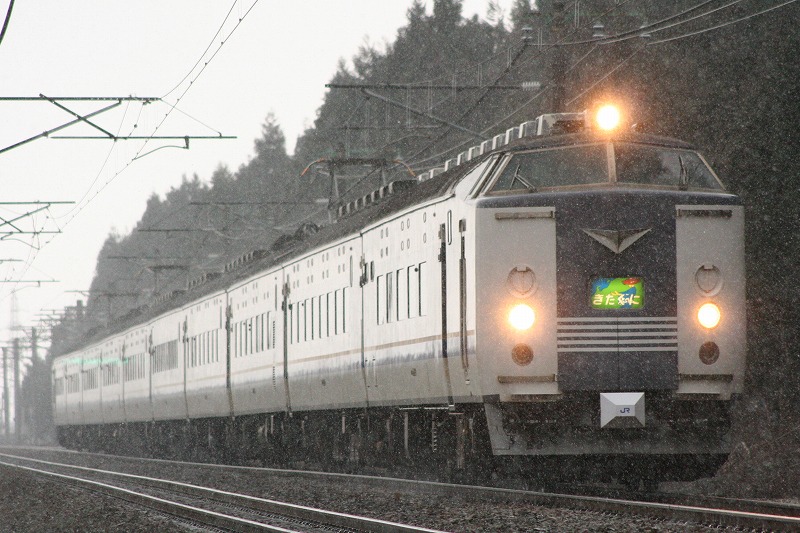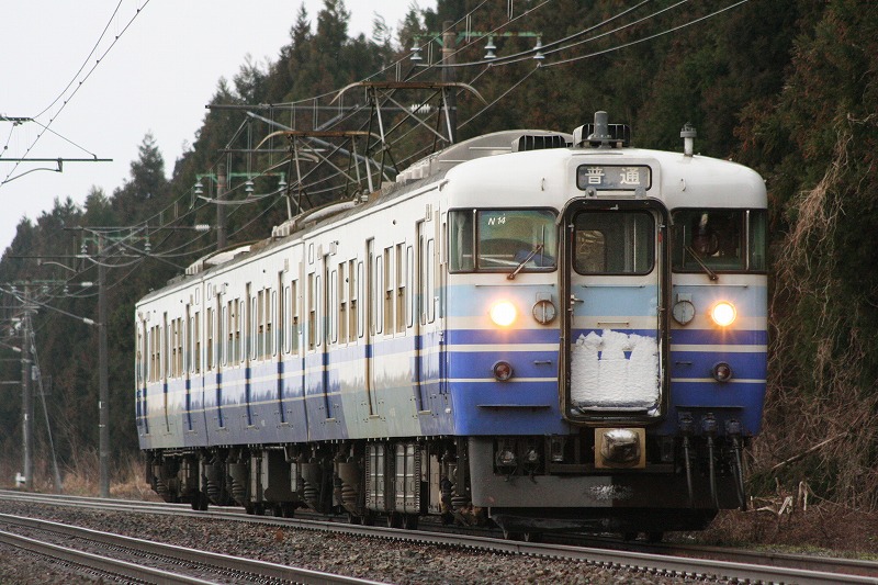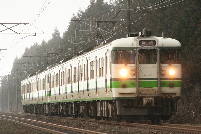 きたぐにが通過すると、雪は収まってきました。でも、115系には雪が。