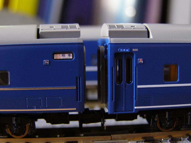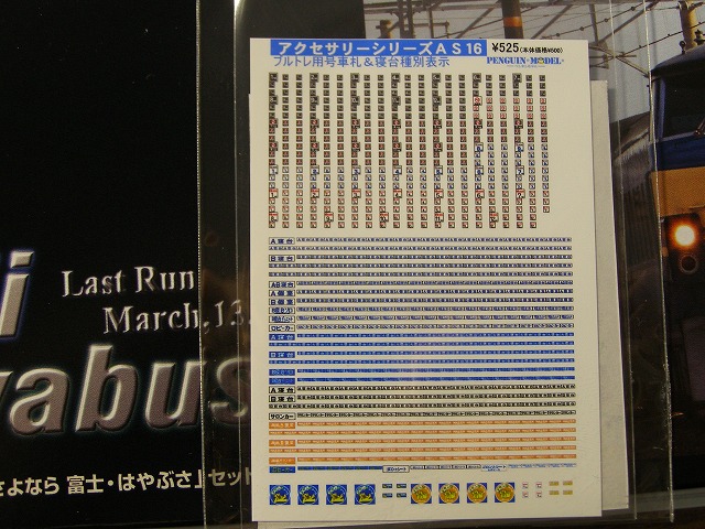 ボケてますが、各種シールを貼ったもの。行き先幕は実感味だけでなく、「富士」と「はやぶさ」編成の車両を見分けるための手段でもあります。