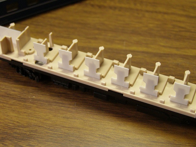 プラ板から自作したもので、型を取れば量産は簡単ですが、何しろ両数が多いので面倒です・・。
