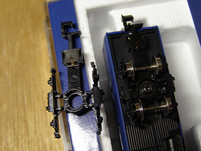 画像左が元々ついていた台車で、首?のところが短い一方、カプラーが長いタイプでした。