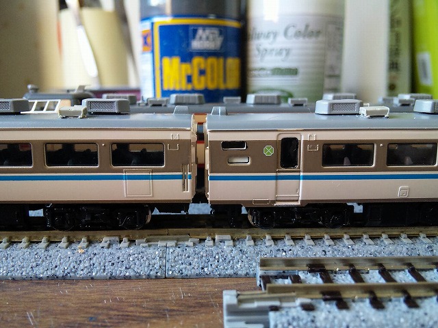 クロハ編成は元々台車がグレーですが、今回連結器周りも塗装。最初からグレーの連結器を採用してくれてもいいようなものを・・。